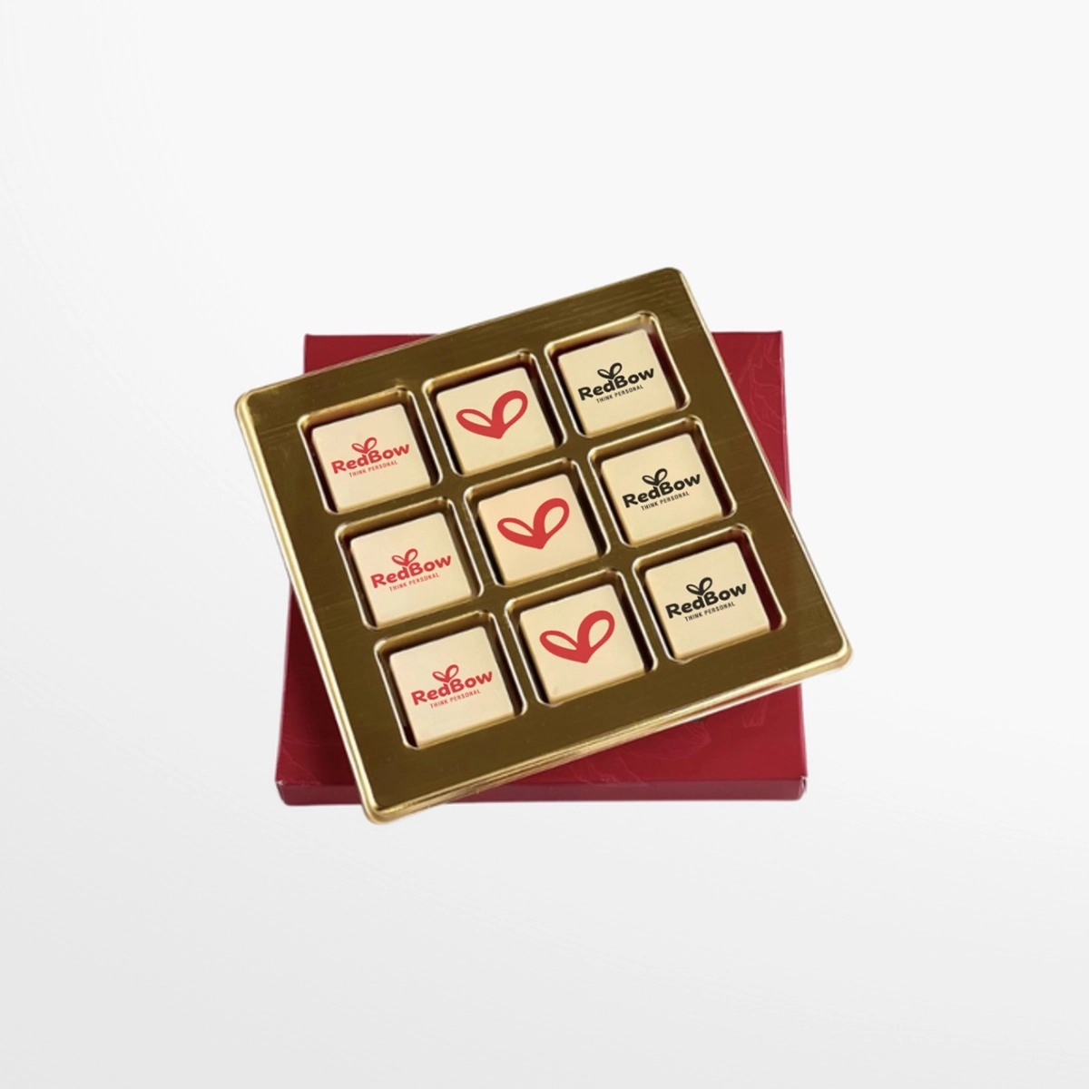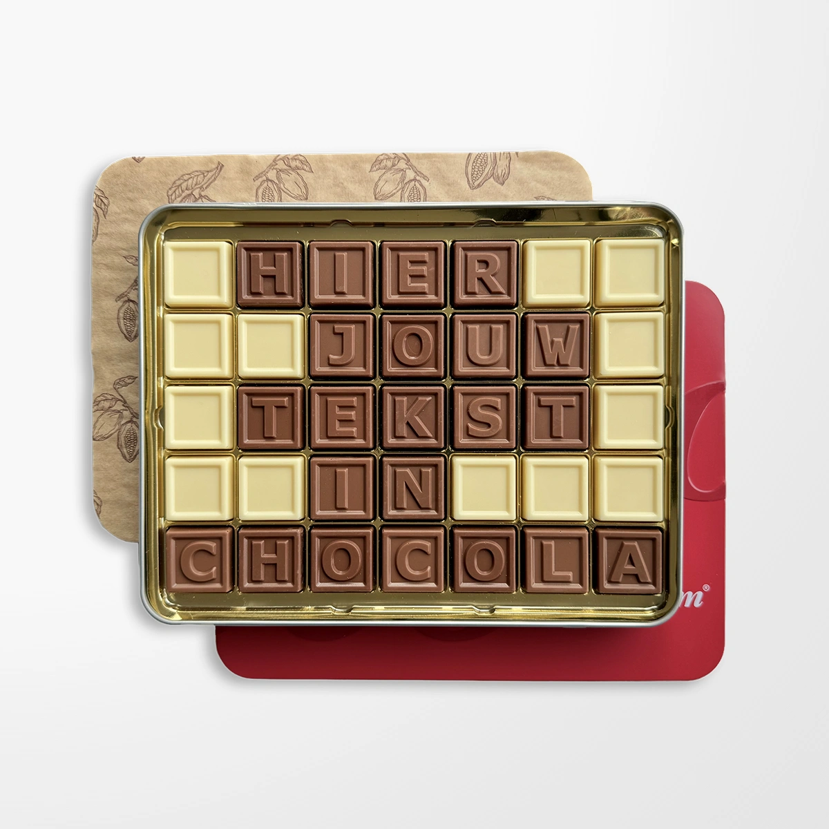 Chocolade in een op maat gemaakt doosje, met een persoonlijke boodschap aan de binnenkant; een warm en uniek cadeau.