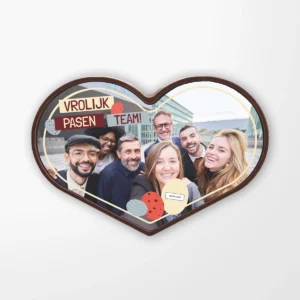 Het hart is van heerlijke melkchocolade afgewerkt met een laagje marsepein waarop met een speciaal printprocedé elke gewenste foto, afbeelding of tekst haarscherp wordt aangebracht. Het chocoladehart is van duurzaam geproduceerde Cocoa Horizons chocolade van Barry Callebaut, hét Belgische topmerk. Zo geeft je iemand niet alleen een mooi en persoonlijk cadeau, maar ook een verantwoorde keuze.